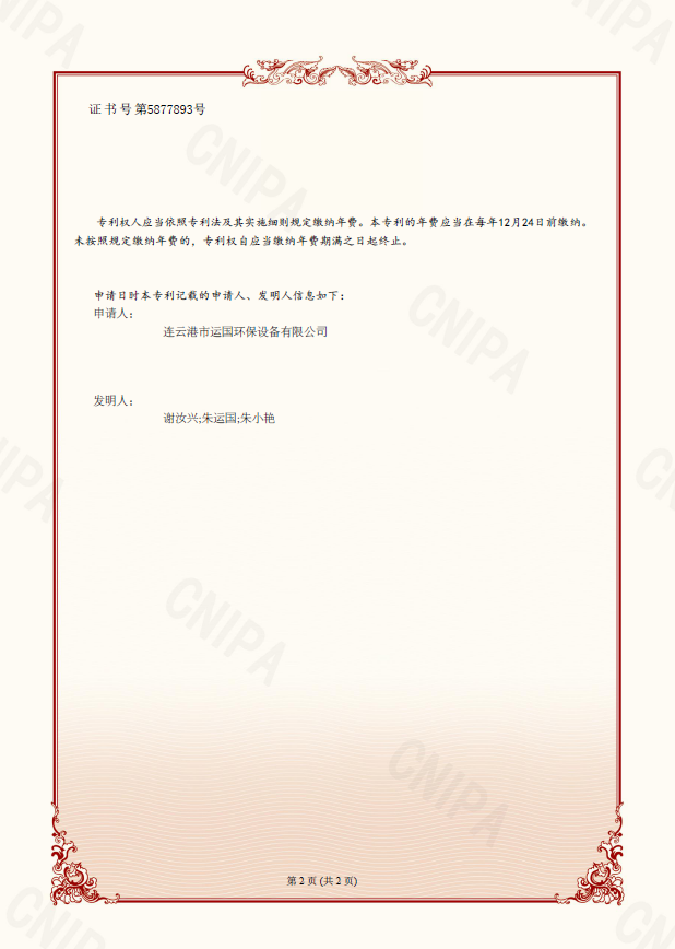 熱烈祝賀連云港運國環保設備有限公司獲得一種新型全自動水過濾器發明專利證書。
