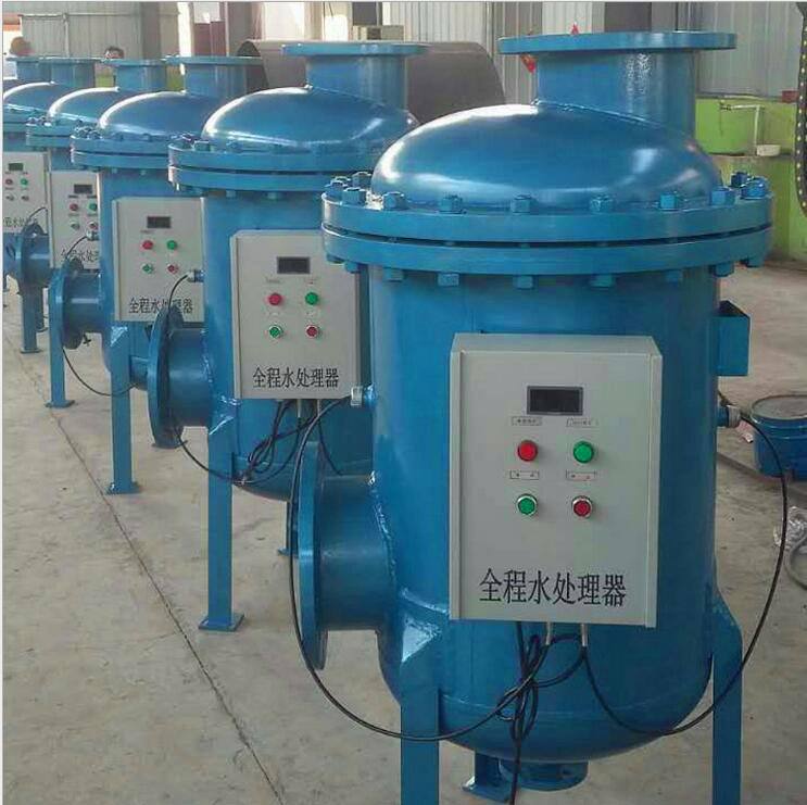 全程綜合水處理器主要由優(yōu)質(zhì)碳鋼筒體、特殊結(jié)構(gòu)的不銹鋼網(wǎng)、高頻電磁場發(fā)生器、電暈場發(fā)生器及排污裝置等組成。通過活性鐵質(zhì)濾膜,機(jī)械過濾器變徑孔阻擋及電暈效應(yīng)場三位一體的綜合過濾體,吸附、濃縮在實(shí)際運(yùn)行工況下各種水系統(tǒng)形成的硬度物質(zhì)及復(fù)合垢,降低其濃度,達(dá)到控制污垢及大部分硬度垢的目的。并通過換能器將特定頻率能量轉(zhuǎn)換給被處理的介質(zhì)——水,形成電磁極化水,使其成垢離子間的排列順序位置發(fā)生扭曲變形,當(dāng)水溫升高到一定程度時,處理的水需經(jīng)過一段時間方能恢復(fù)到原來的狀態(tài)。在此階段,成垢的機(jī)率很底,因而達(dá)到控制形成硬度垢的目的。同時器壁金屬離子受到抑制,對無垢系統(tǒng)具有防腐蝕作用。此外,電磁極化水還可有效地殺滅水中的菌類、澡類等,有效地抑制水中微生物的繁殖。所以,全程綜合水處理器在系統(tǒng)正常運(yùn)行狀態(tài)下,可以完成防結(jié)垢、防腐,殺菌,滅藻,超凈過濾,控制水質(zhì)的綜合功能。